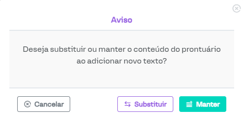 Entretanto, se o texto já inserido puder ser descartado, mantendo apenas o modelo do prontuário a ser inserido, basta clicar no botão Substituir.