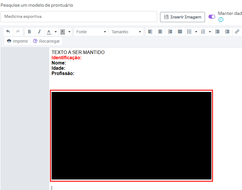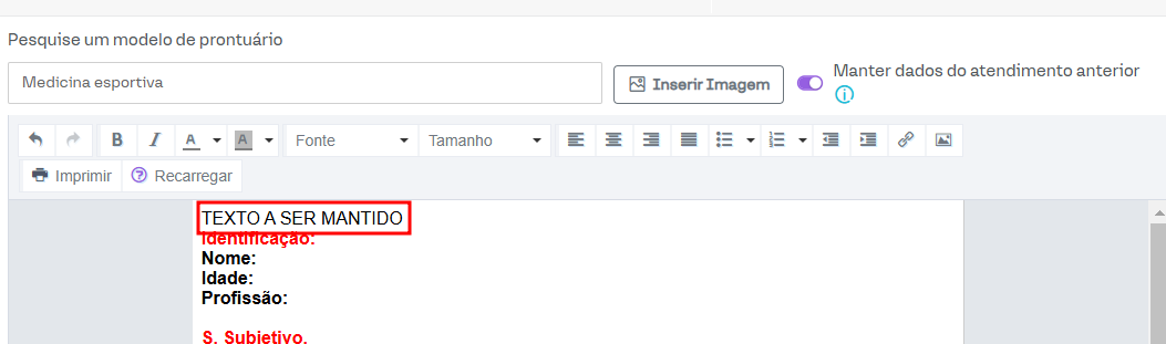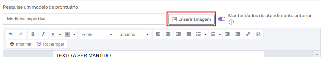 Caso deseje incluir o modelo de prontuário, mantendo o texto já inserido no campo, basta clicar no botão Manter.