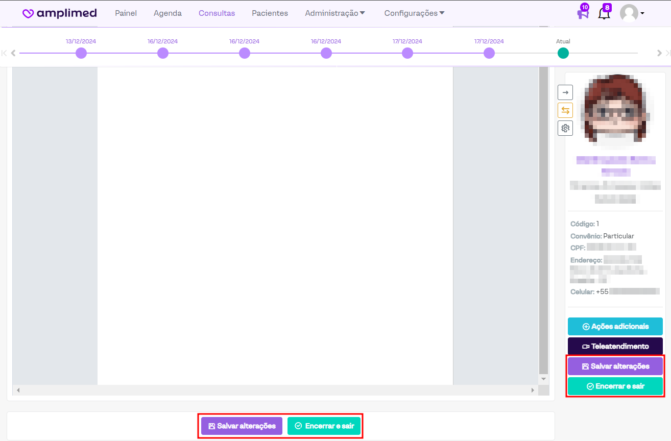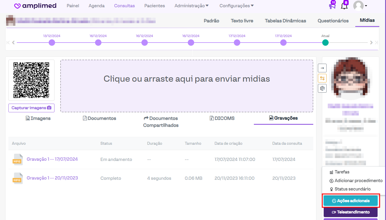 Na barra lateral direita, onde estão localizadas as informações do paciente, há também um botão Ações Adicionais, que permite realizar algumas ações, as quais detalharemos a seguir.