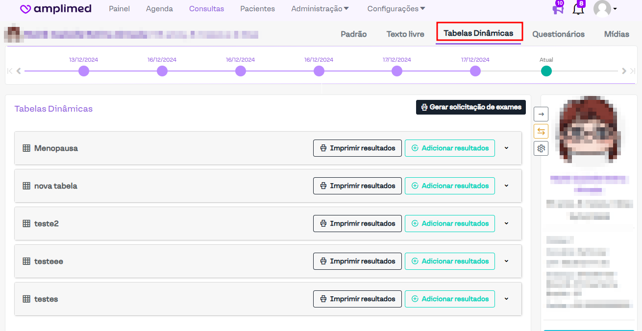 Vale ressaltar que os exames solicitados através desta funcionalidade não ficam salvos no cadastro do paciente; ela facilita apenas a solicitação dos exames e o compartilhamento com o paciente. Somente ao incluir os resultados dos exames nessa funcionalidade é que eles ficam registrados.