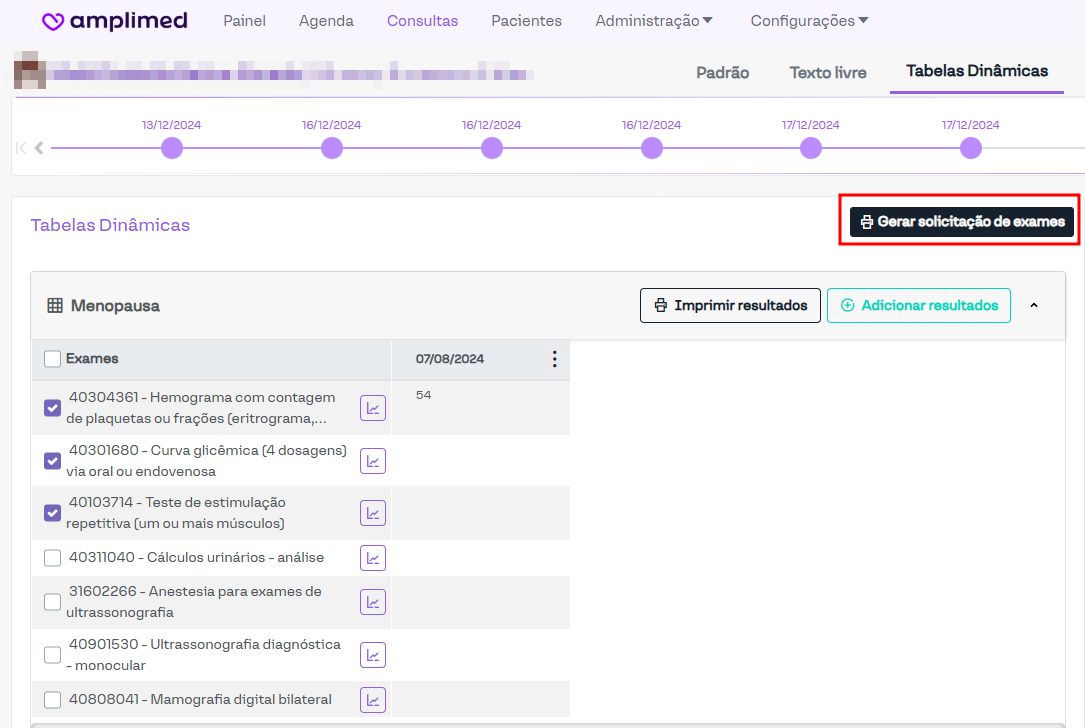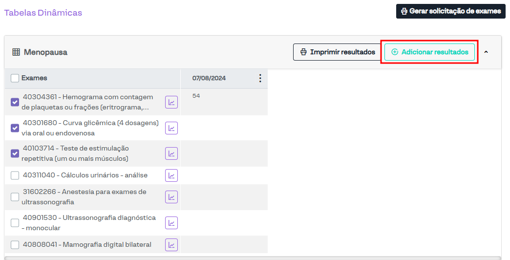 Ao expandir uma das tabelas cadastradas, será possível selecionar os exames que farão parte da solicitação gerada para o paciente. Após a seleção, basta clicar no botão Gerar solicitação de exames.