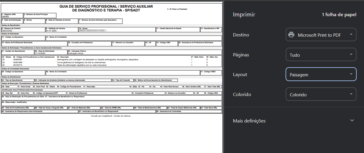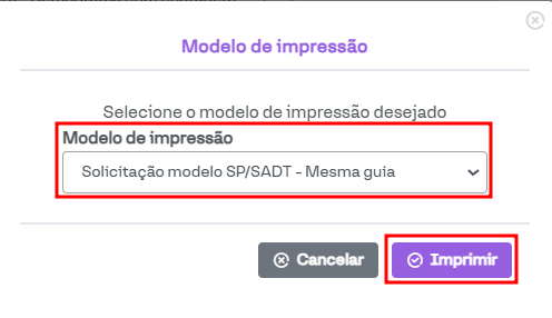 Em seguida, selecione o modelo de impressão (dentre as opções: SP/SADT - Mesma guia, Guias separadas e Solicitação personalizada) e clique em Imprimir.