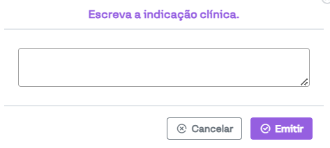 Na sequência, o sistema solicitará a indicação clínica. Preencha o campo conforme necessário e, depois, clique em Emitir.