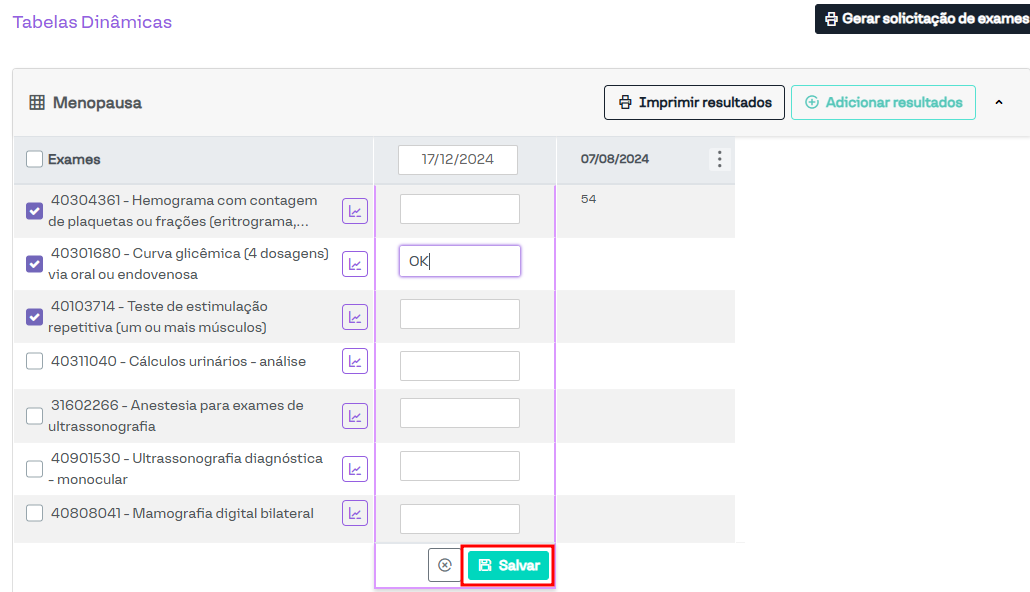 Ao clicar neste botão, será habilitada uma nova coluna na tabela para a inclusão dos resultados. Preencha os campos de acordo com os exames desejados e, por fim, clique em Salvar.