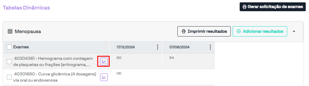 Caso o resultado seja um valor numérico, é possível visualizar a progressão do paciente clicando no ícone em formato de gráfico.