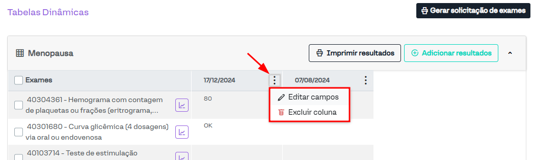 Se necessário, é possível editar os resultados clicando nos três pontinhos na respectiva coluna e selecionando a opção Editar campos.