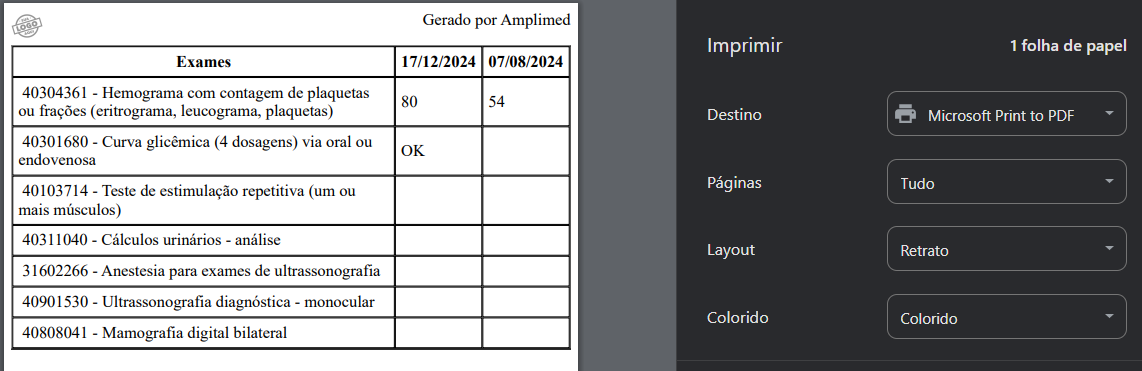 Ao selecionar essa opção, será aberta uma janela de impressão com a tabela de exames e seus respectivos resultados, conforme ilustrado abaixo.