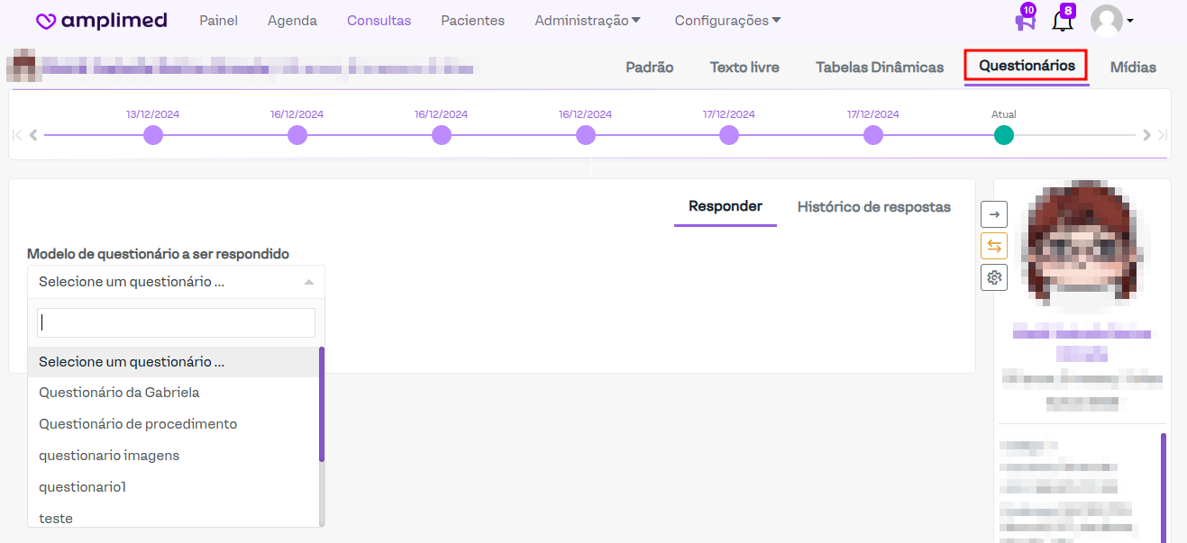 Nesta seção do prontuário, caso o módulo de questionários esteja habilitado para a clínica, é possível visualizar os questionários respondidos pelos pacientes e também respondê-los durante o atendimento.