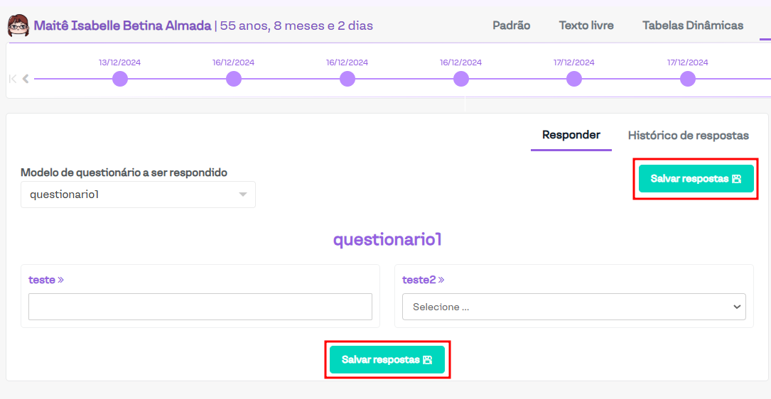 Ao selecionar um questionário, ele será aberto dentro do prontuário. Após preencher os campos, basta clicar em Salvar respostas para que as informações sejam registradas no sistema.