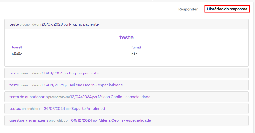 Para visualizar as respostas, vá até a seção Histórico de respostas e clique no questionário desejado.