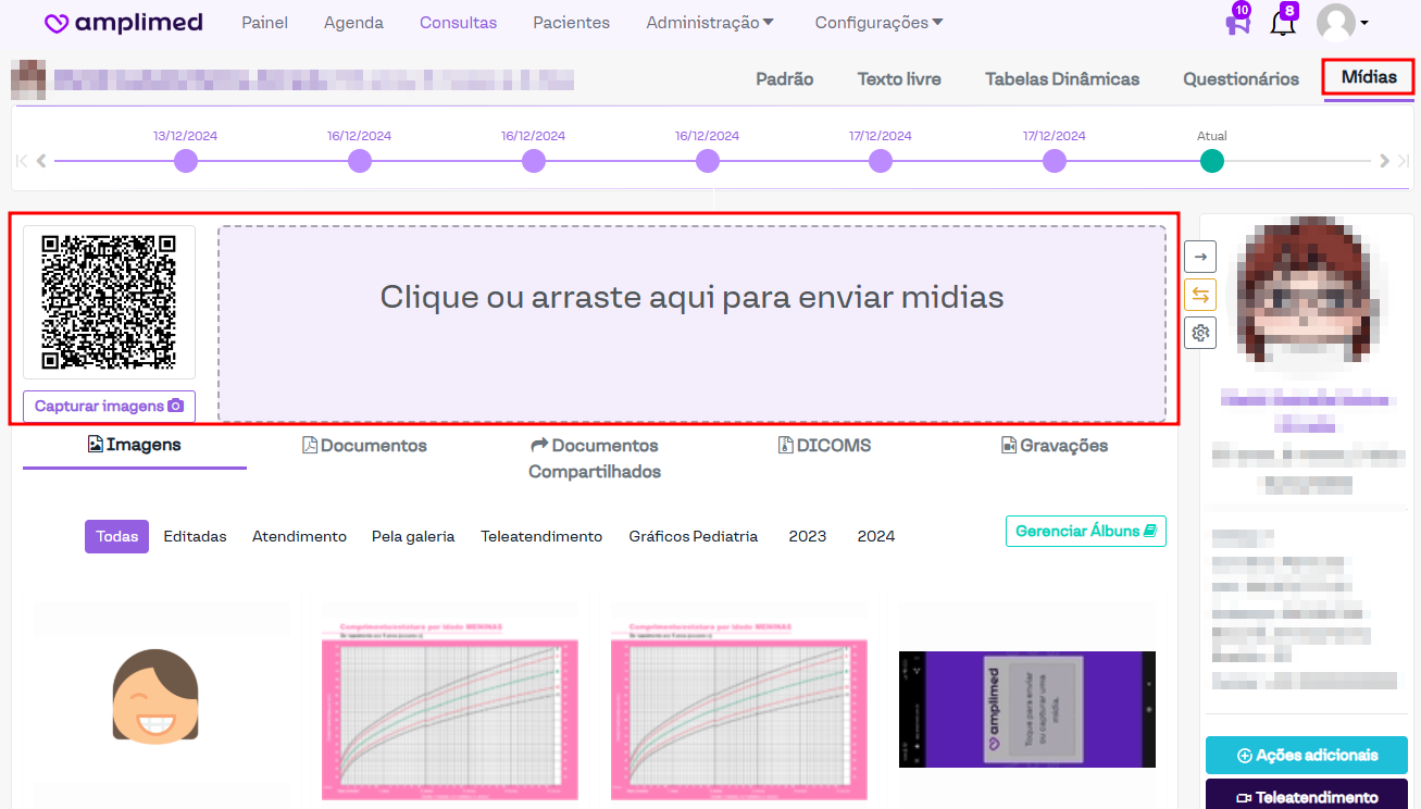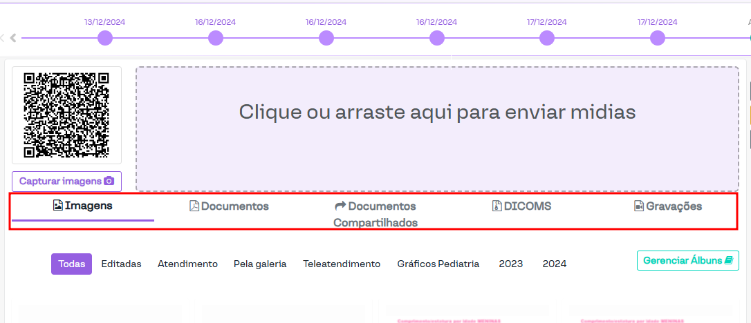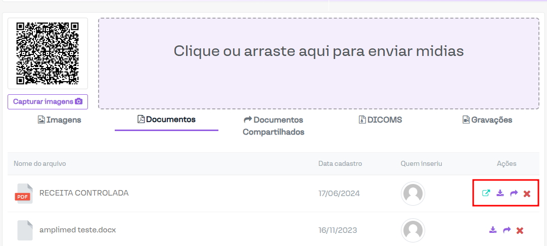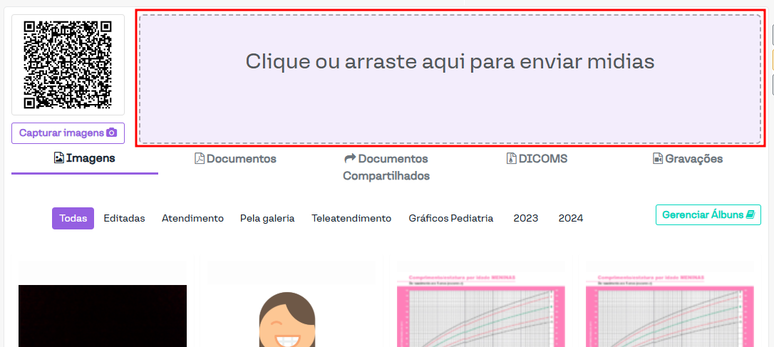 A seção destacada na imagem acima é responsável pelo envio de arquivos. Caso a mídia que deseja incluir esteja em outro dispositivo, é possível utilizar o QR Code no dispositivo que contém o arquivo para enviá-lo para o prontuário.