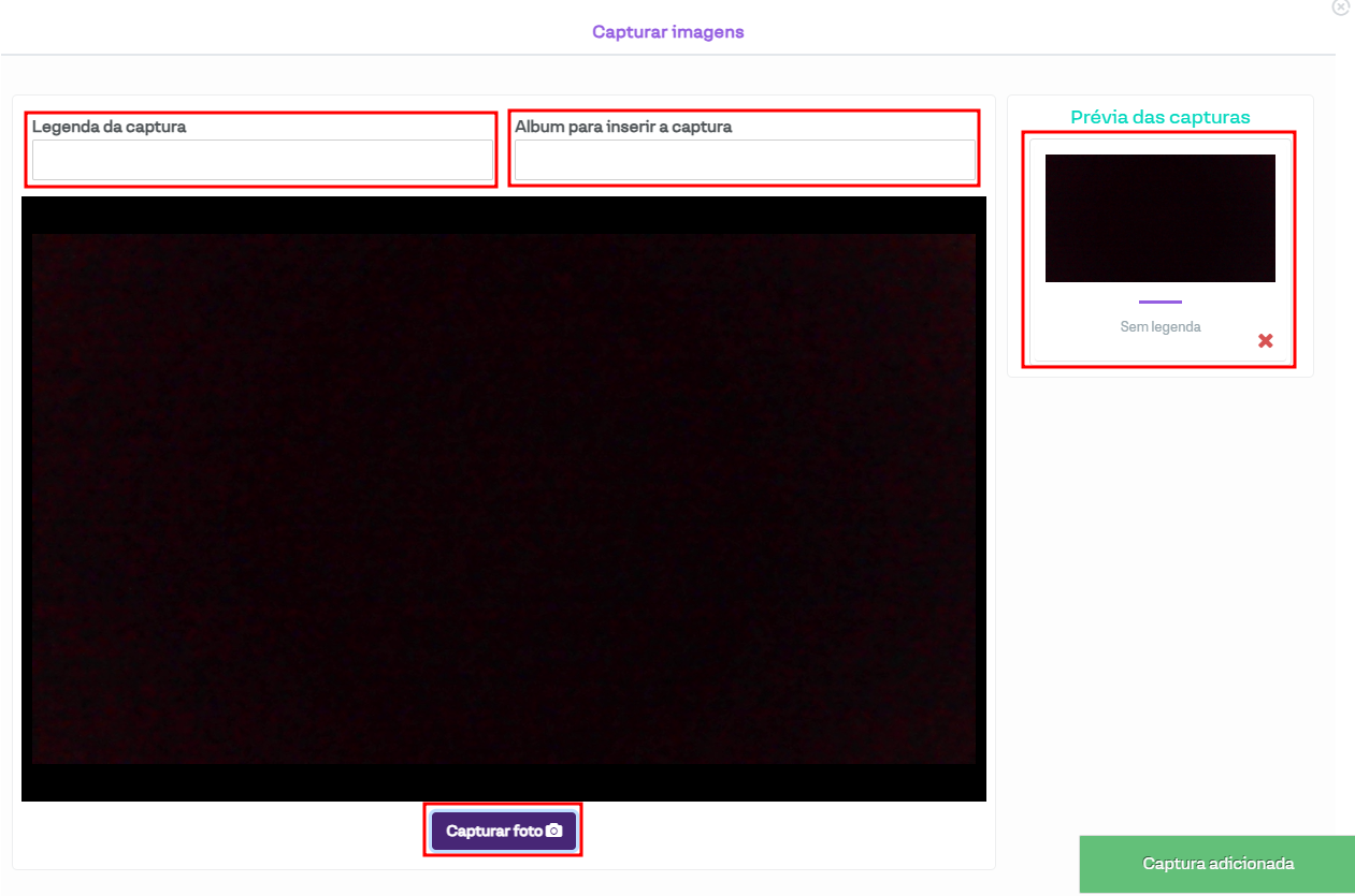 Após conceder a permissão, abrirá uma janela para capturar a imagem. Ao clicar no botão Capturar foto, o sistema manterá as imagens capturadas dispostas na lateral direita. É possível adicionar uma legenda e selecionar um dos álbuns previamente cadastrados.