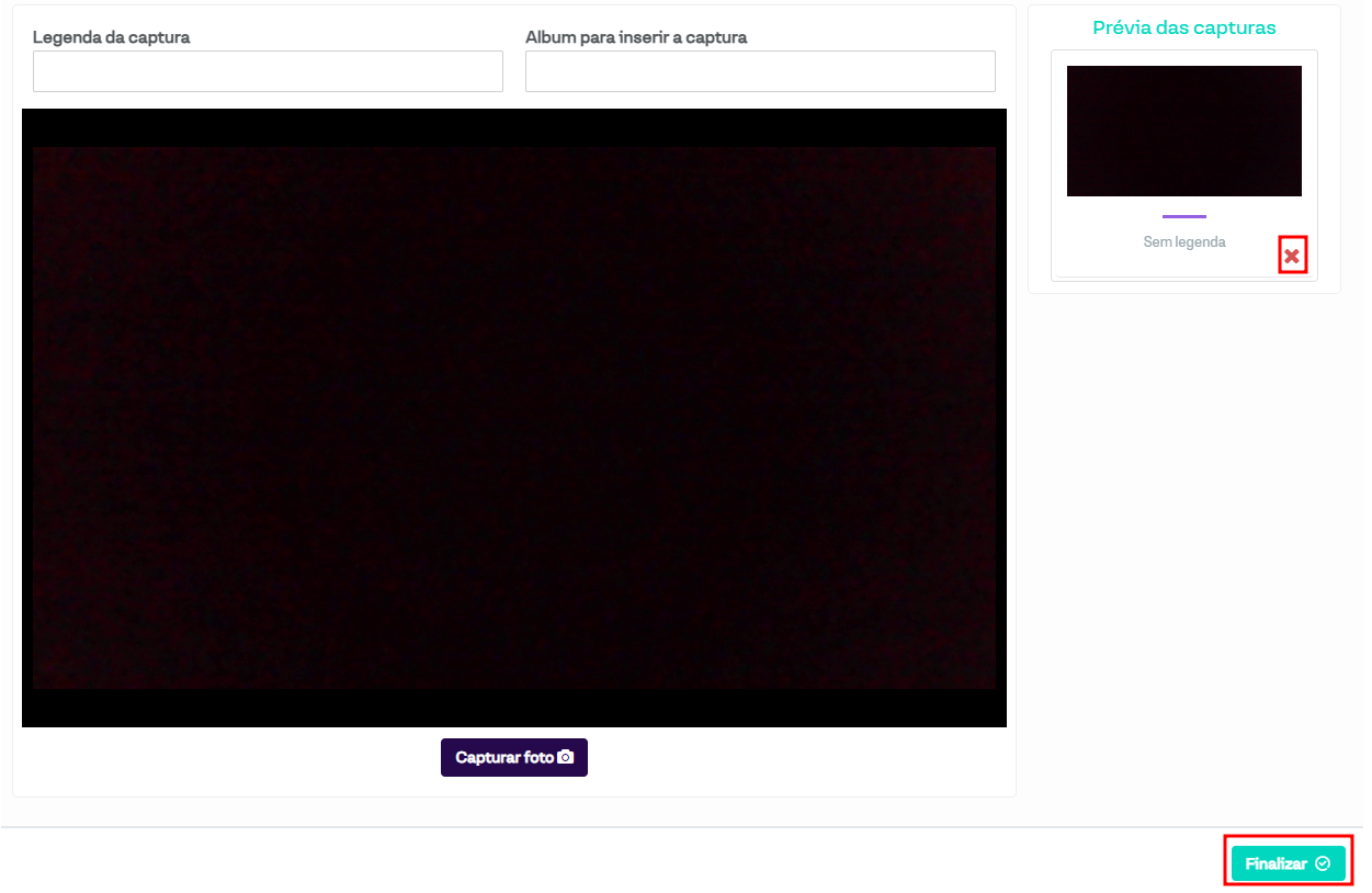 Além disso, é possível excluir uma imagem capturada clicando no ícone em 'x' localizado abaixo da miniatura da imagem. Após realizar as capturas, basta clicar em Finalizar.
