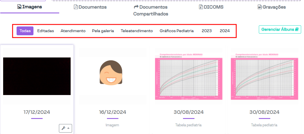 As imagens enviadas para o sistema, tanto através do cadastro do paciente quanto durante os atendimentos, serão exibidas aqui. Abaixo, há filtros que permitem refinar a exibição das imagens, que podem variar conforme o paciente e os atendimentos realizados.