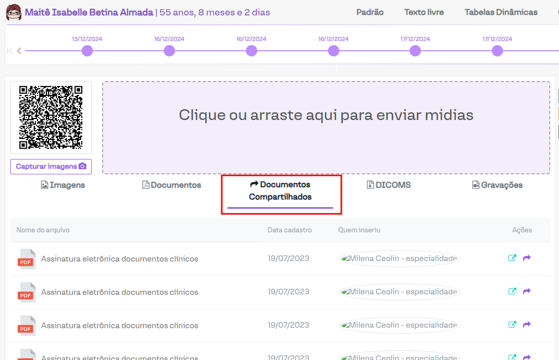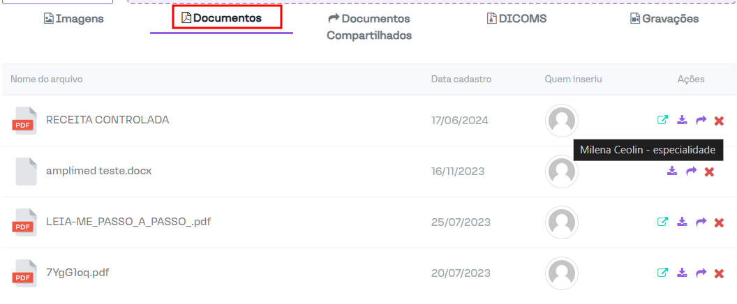 Esta seção exibe os documentos que foram compartilhados com o paciente, incluindo tanto os documentos gerados pelo prontuário e compartilhados, quanto os arquivos que foram enviados e, posteriormente, compartilhados.
