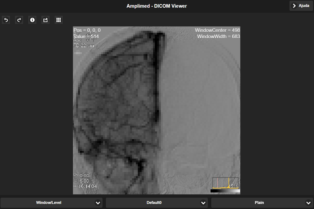 É possível visualizar o arquivo e realizar ajustes conforme necessário nos campos Window/Level (com opções de zoom e desenhar na imagem), Default0 (min/max) e Plain (permite alterar a visualização das cores).