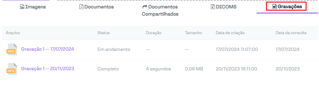 Vale destacar que apenas as gravações no status Completo podem ser visualizadas.