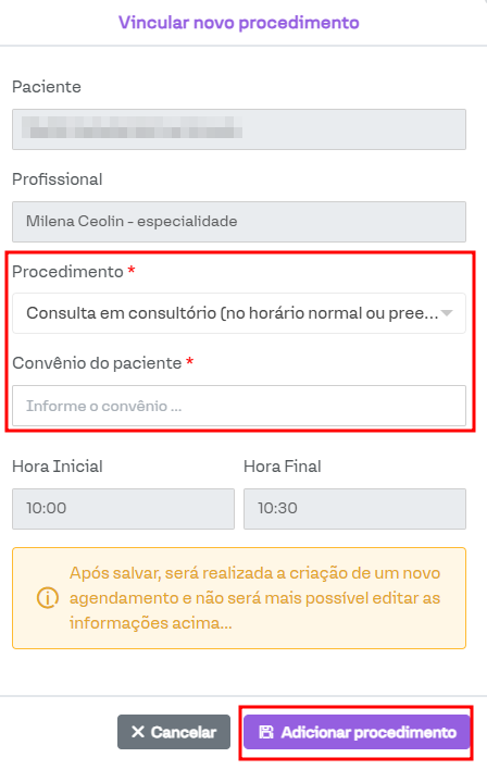 Após isso, basta clicar em Adicionar Procedimento, e o agendamento será criado.