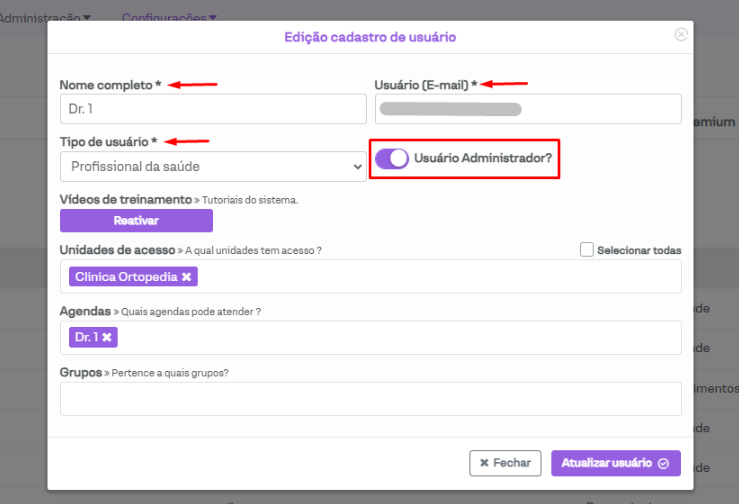 Ao final do seu ajuste nas opções apresentadas, lembre que é preciso clicar em "Atualizar usuário" para salvar. Mas caso sua intenção seja apenas de visualizar ou consultar elas, clique em "Fechar" para sair da janela de edição.