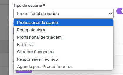 Há diversos tipos de usuário que podem ser escolhidos conforme a necessidade da clínica