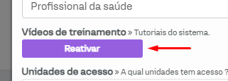 Caso seja necessário reativar os vídeos de treinamento do sistema para um usuário, na janela que será aberta após clicar no ícone de lápis em roxo, clique no botão "Reativar".