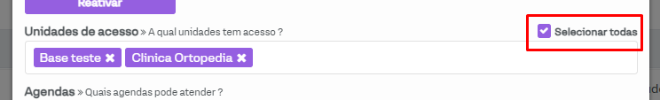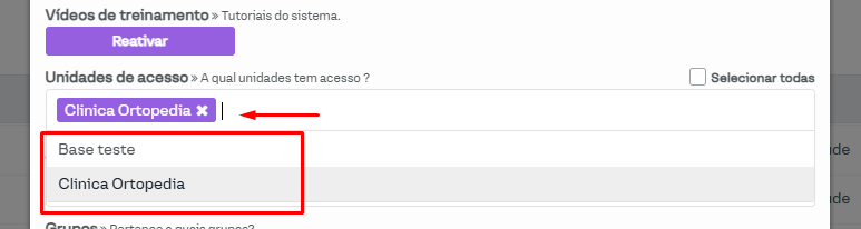 É possível também que o usuário selecionado tenha acesso apenas as unidades que irá atender. Por exemplo, se o(a) profissional ou o(a) secretário(a) irá atender somente na Unidade "Clínica Ortopedia", é possível deixar o acesso a somente ela. Assim, o usuário terá acesso a unidade escolhida e aos seus respectivos locais.