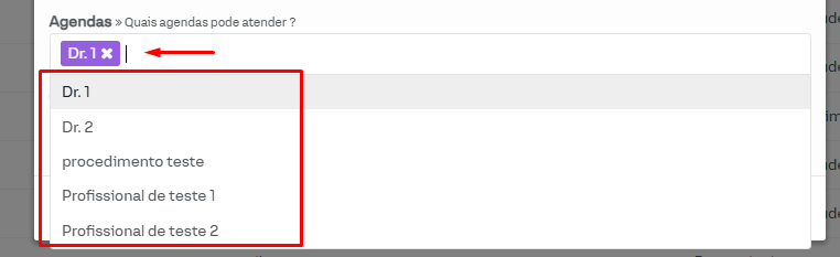 Para ajustar as agendas que o usuário pode atender, basta clicar na barra abaixo do campo "Agendas". Será aberta uma lista com todos usuários que possuem agendas na clínica e elas poderão ser incluídas ou removidas, conforme a necessidade. Dica importante: caso o usuário precise acesso apenas sua própria agenda, selecione apenas o nome deste usuário.