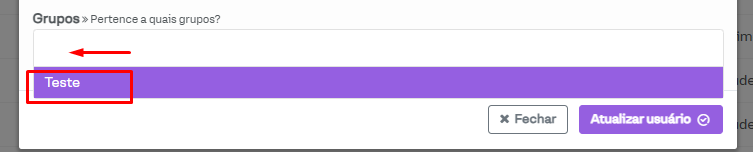 Além das outras opções, há a opção de adicionar o usuário a um ou mais grupos de usuários cadastrado na clínica. Para adicionar ou remover o usuário de um grupo, basta clicar na barra abaixo do campo "Grupos", onde será expandida uma lista com todos os grupos de usuários da clínica e seleciona-las, conforme desejado.