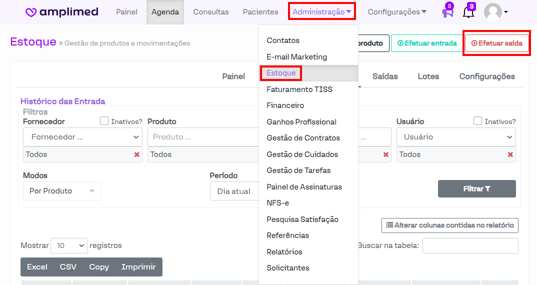 Existem duas formas de registrar a saída de produtos: pelo Estoque ou pela Agenda. A seguir, explicaremos cada uma delas.