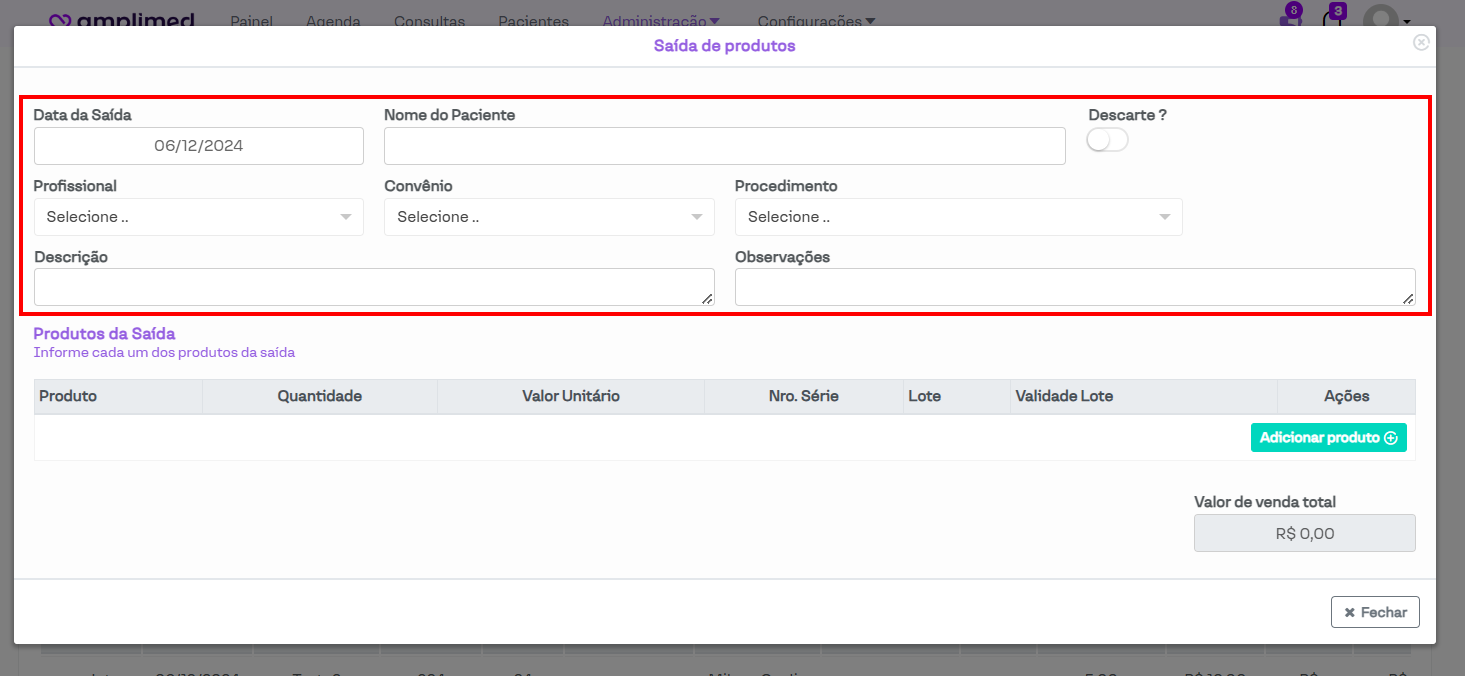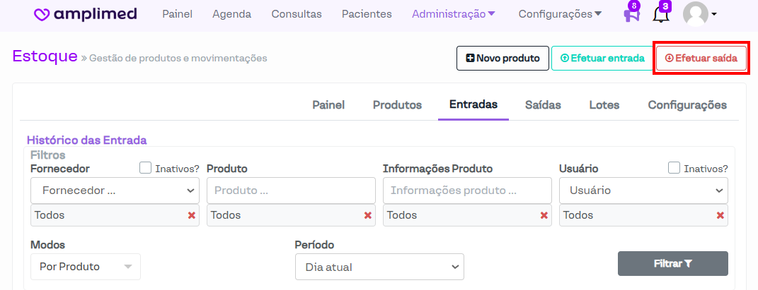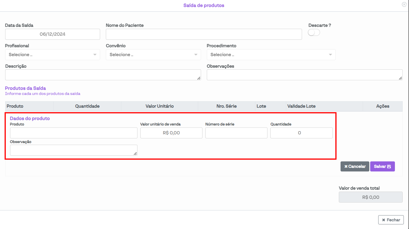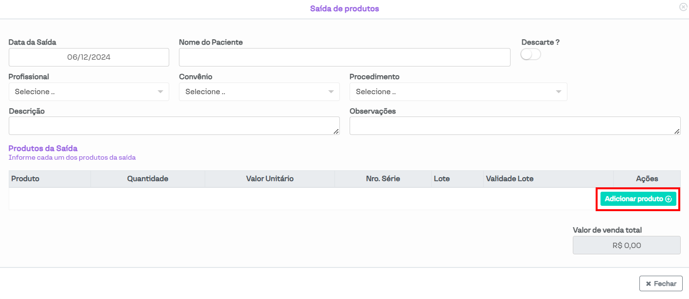 A saída de produtos é utilizada para manter o controle do estoque, permitindo a associação com um procedimento, paciente, profissional e convênio.