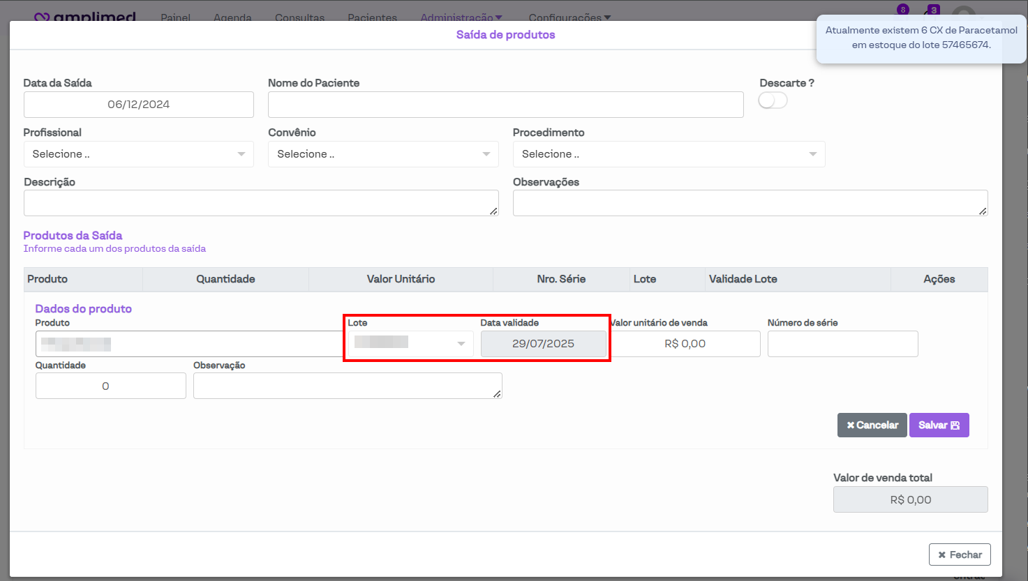 Ao selecionar um produto que possua controle por lotes, os campos Lote e Data de validade serão habilitados. Vale destacar que, ao selecionar o produto, uma notificação será exibida no canto superior direito da tela, informando a quantidade atual do item em estoque.