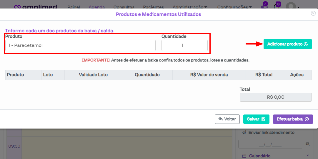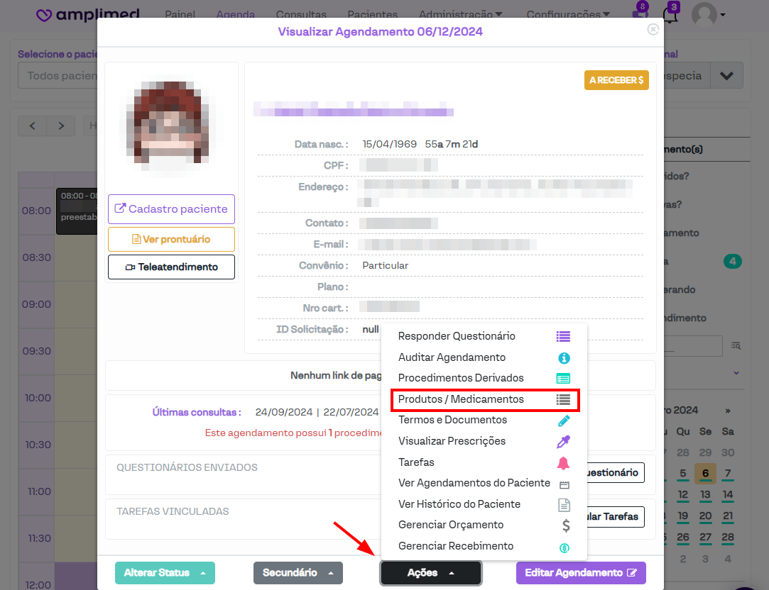 Acesse: Agenda > Agendamento > Ações > Produtos / Medicamentos