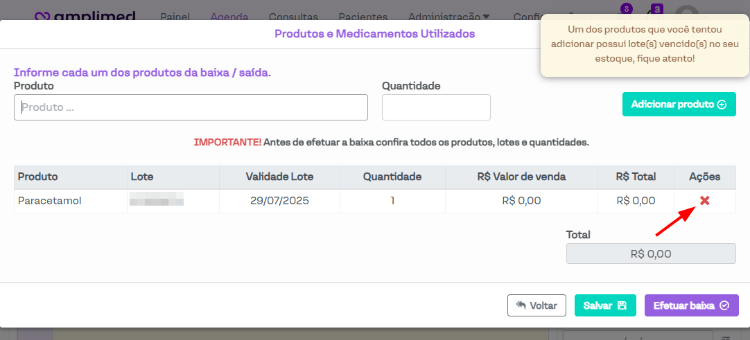 Após a inclusão do primeiro produto, é possível adicionar outros itens seguindo o mesmo procedimento. Para excluir um produto já adicionado, basta clicar no ícone em formato de "X" localizado à direita do registro. É importante ressaltar que, caso o produto incluído esteja sujeito a controle de lotes e algum dos lotes disponíveis esteja vencido, o sistema emitirá uma notificação na parte superior direita da tela, alertando o usuário sobre essa situação.