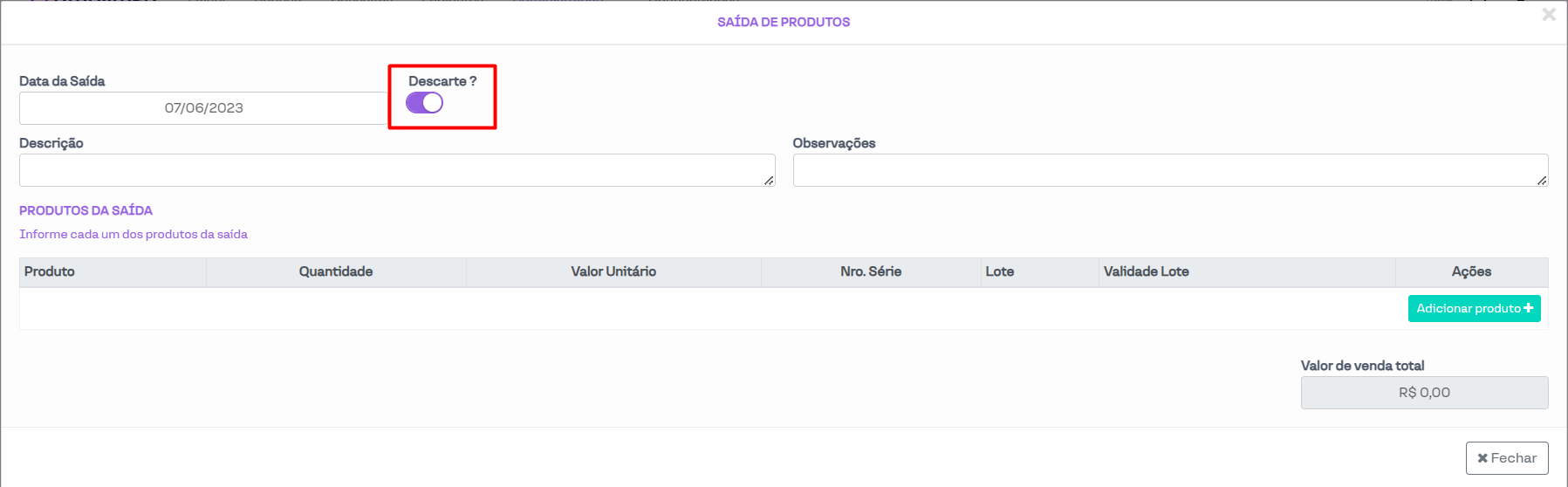 Descarte: Indica se a saída se trata de um descarte ou de uma saída regular. Detalhes sobre o descarte serão apresentados mais adiante.