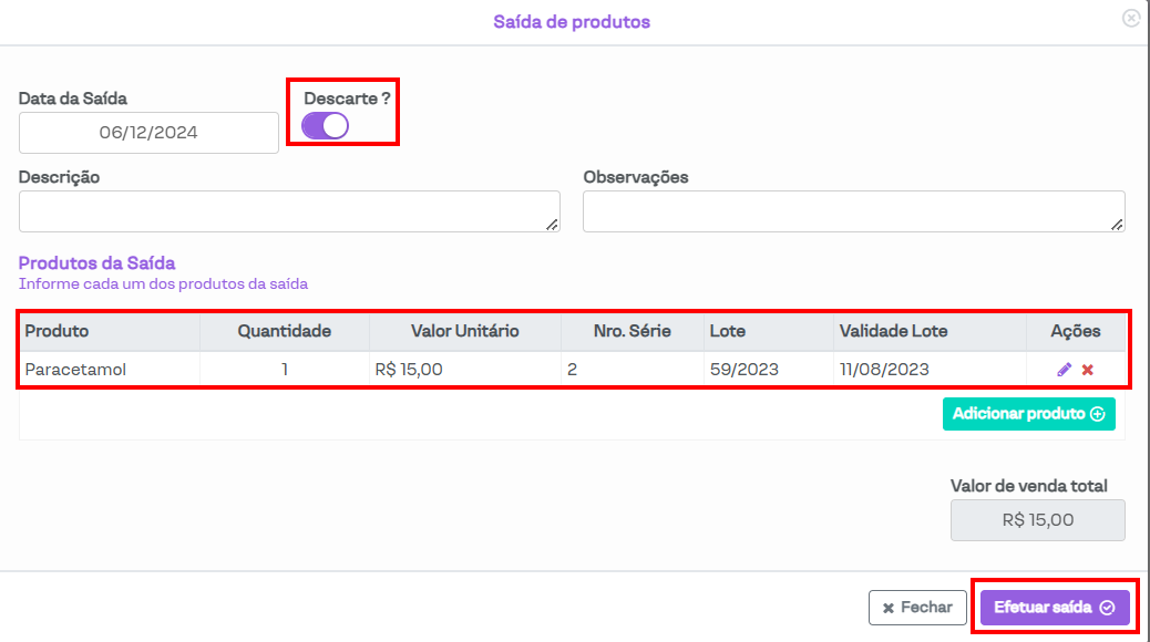 Após o preenchimento completo dos campos de um produto, clique no botão Salvar para adicioná-lo à lista de produtos da saída. Após isso, é possível editar suas informações clicando no ícone de lápis roxo ou remover o item da saída clicando no ícone de X vermelho.