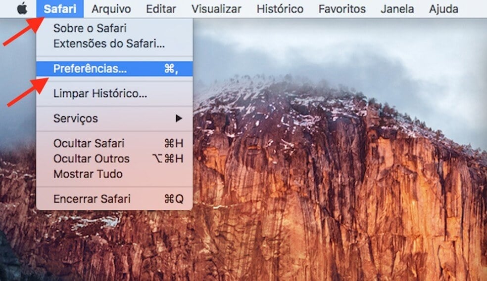 Navegador Safari no MAC: Com o Safari aberto, clique na opção “Safari”, localizada no topo da tela. Em seguida, acesse “Preferências”;