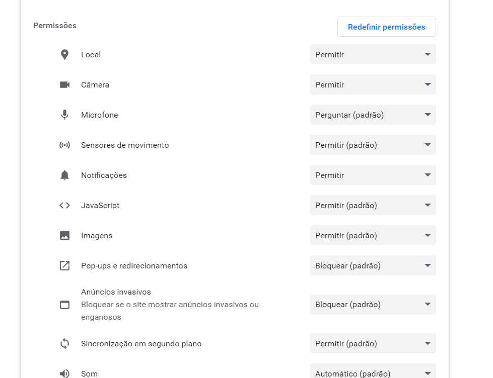 Localizando como configurações do site na parte inferior das opções de segurança da página e permitindo o acesso aos dispositivos.