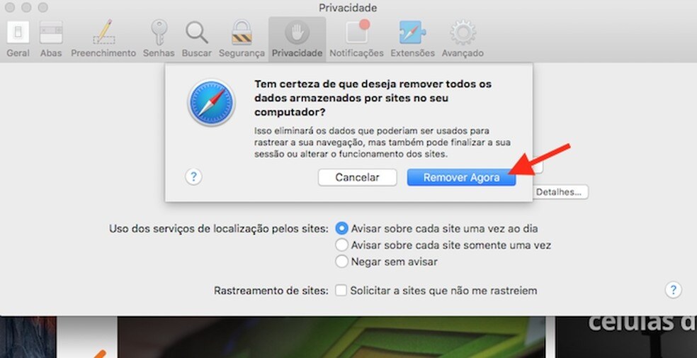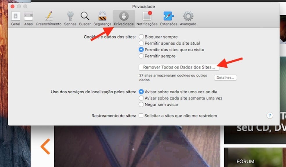 Acessando as preferências do Safari no Mac OS, na sessão “Privacidade”, clique na opção “Remover Todos os Dados dos Sites”;