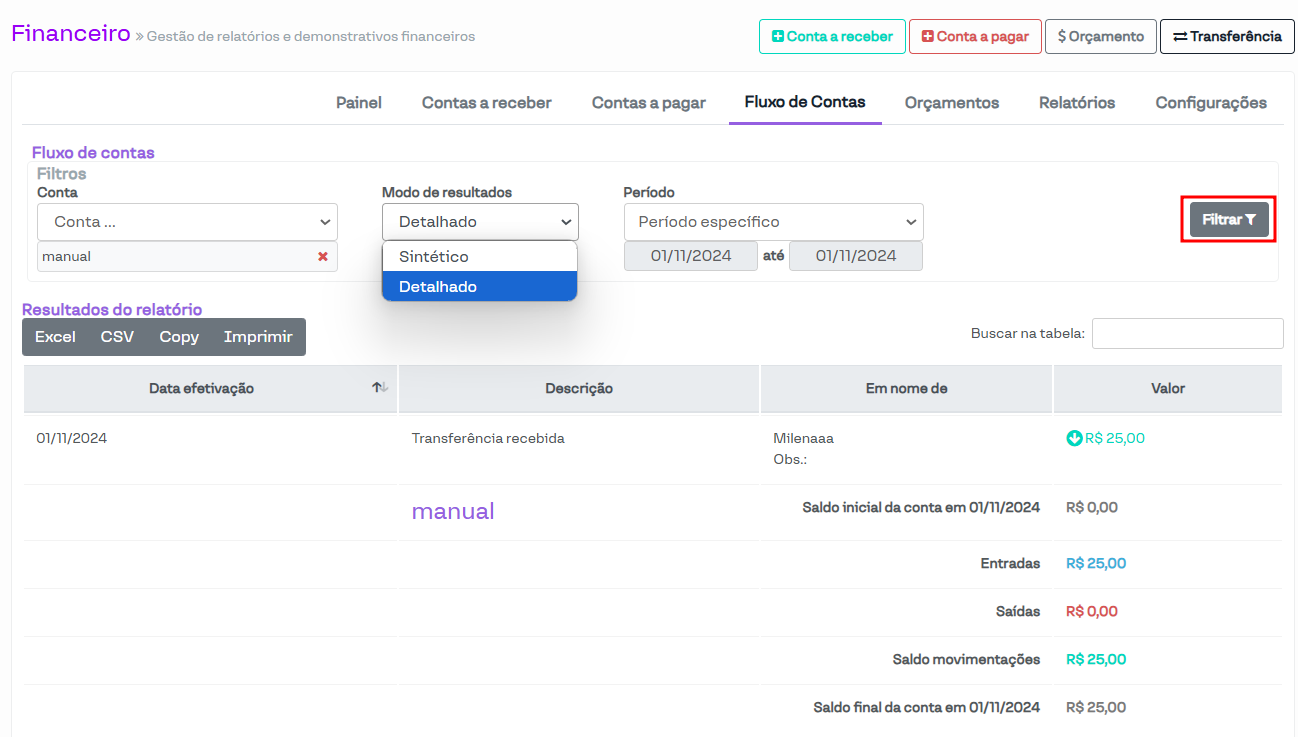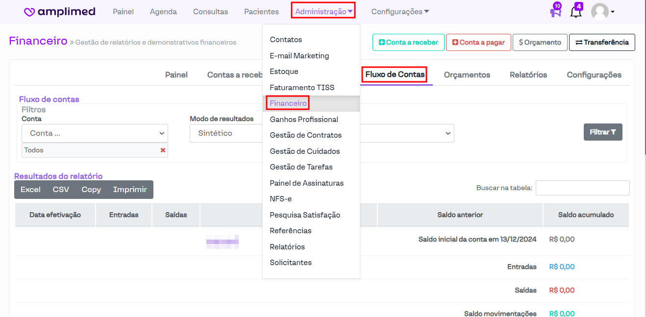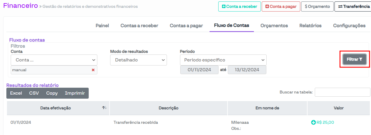 - Período: Permite selecionar o período desejado para visualizar o fluxo de contas.