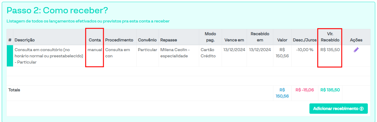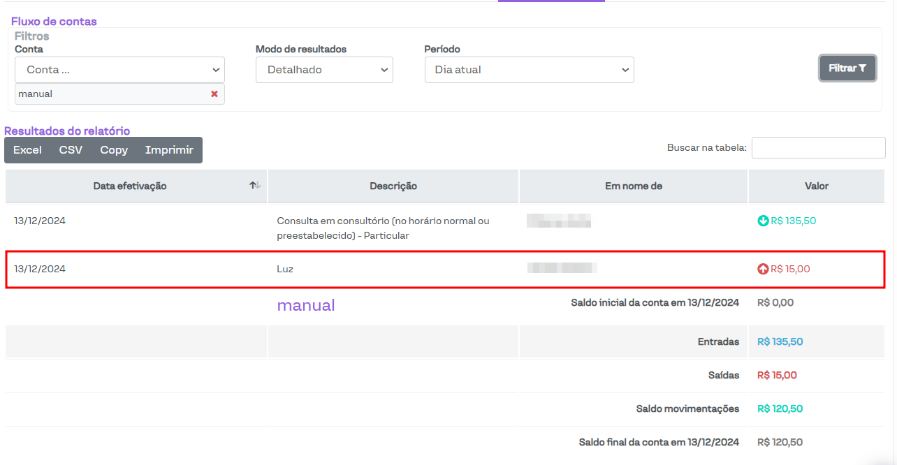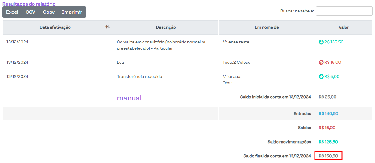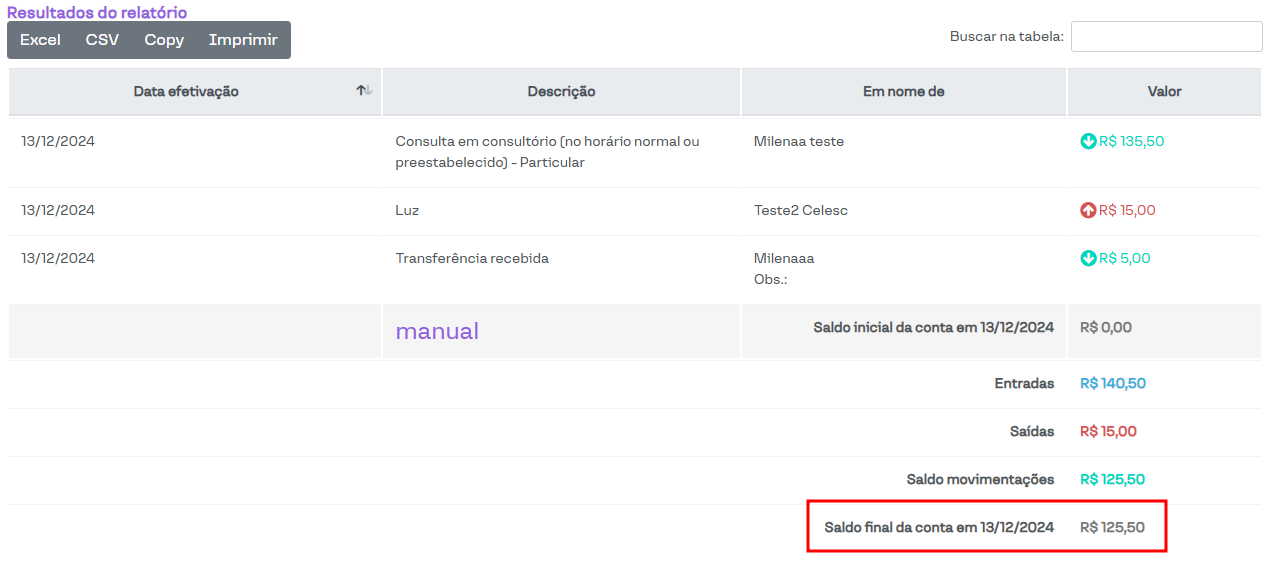 Por exemplo, ao verificar a conta "Manual", o saldo final em 13/12/2024 é de R$ 125,00.