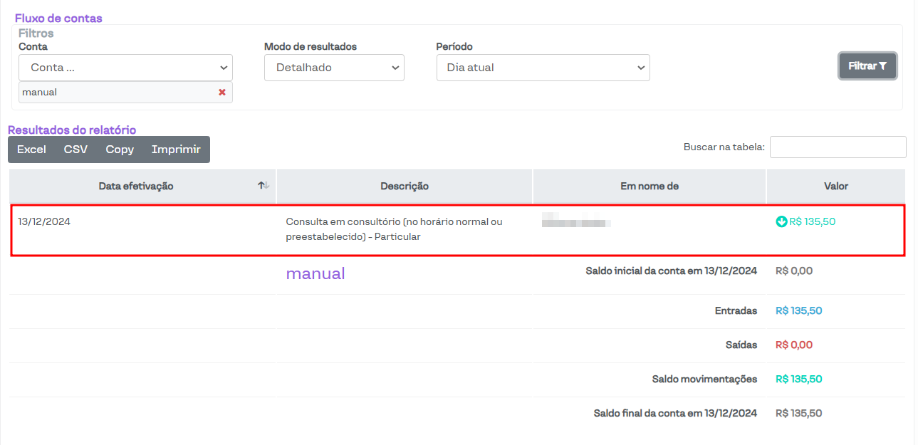 Ao consultar o saldo da conta "Manual" novamente, é possível observar que o saldo final em 13/12/2024 foi incrementado em R$ 25,00. No entanto, não aparecem movimentações na data de 13/12/2024.