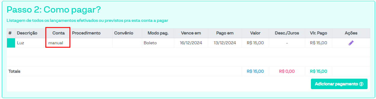 Da mesma forma, ao gerar uma conta a pagar para essa conta e efetivá-la, ela também será registrada no fluxo de contas, conforme ilustrado nas imagens abaixo.
