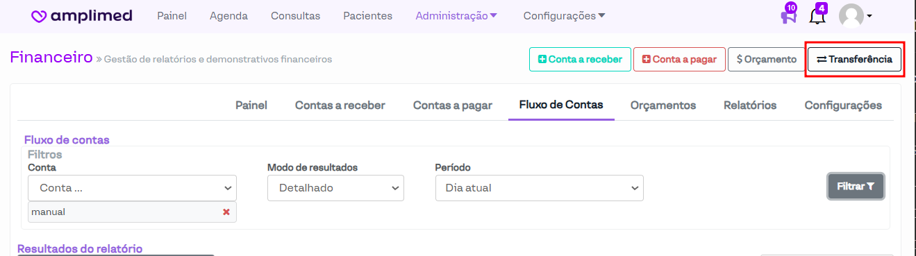 O sistema permite realizar transferências em datas passadas, o que possibilita ajustar o saldo da conta conforme necessário. No entanto, é importante destacar que uma transferência realizada em uma data anterior impactará no saldo final de todo o fluxo de contas de uma clínica.