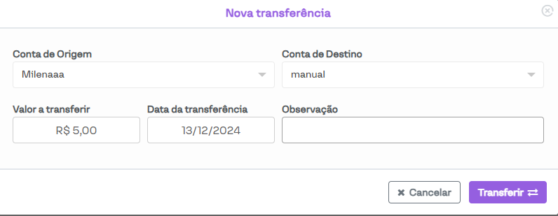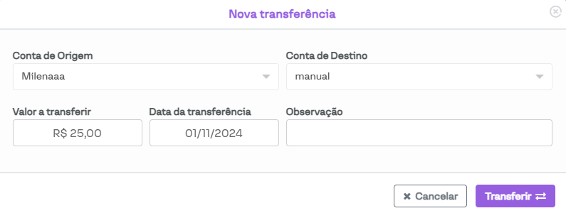 Importante: Transferências não podem ser removidas, portanto, é necessário ter muita cautela ao finalizar a transferência. Para desfazer uma transferência, é preciso realizar a operação inversa na mesma data.