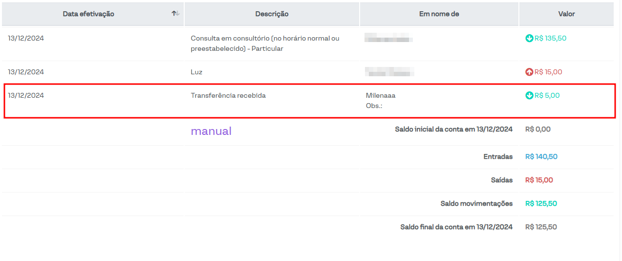 Na conta de destino, a transferência aparecerá da seguinte maneira.