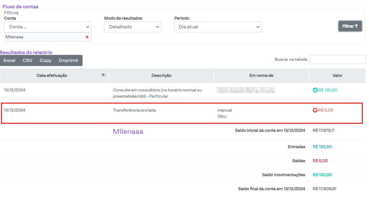 Essa movimentação aparecerá na data selecionada ao realizar a transferência, conforme pode ser observado na imagem a seguir.