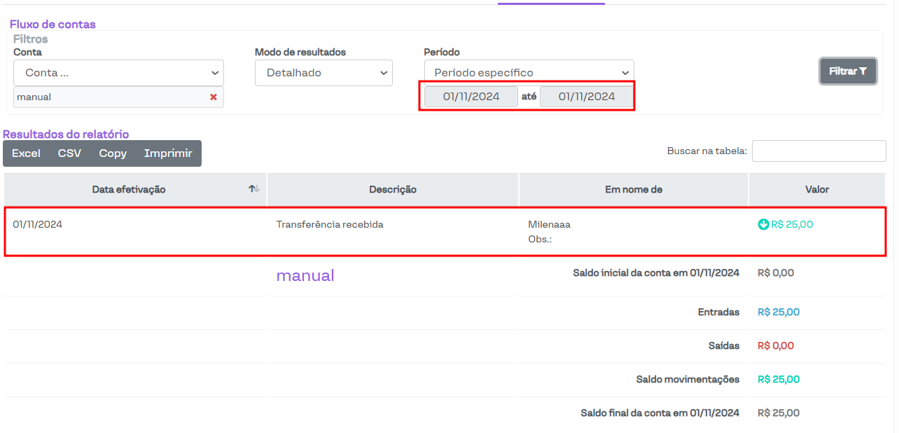 Se uma transferência for realizada para essa conta na data de 01/11/2024, por exemplo, o saldo final da conta em 13/12/2024 será alterado. Vamos realizar uma transferência de R$ 25,00 para a data 01/11/2024.
