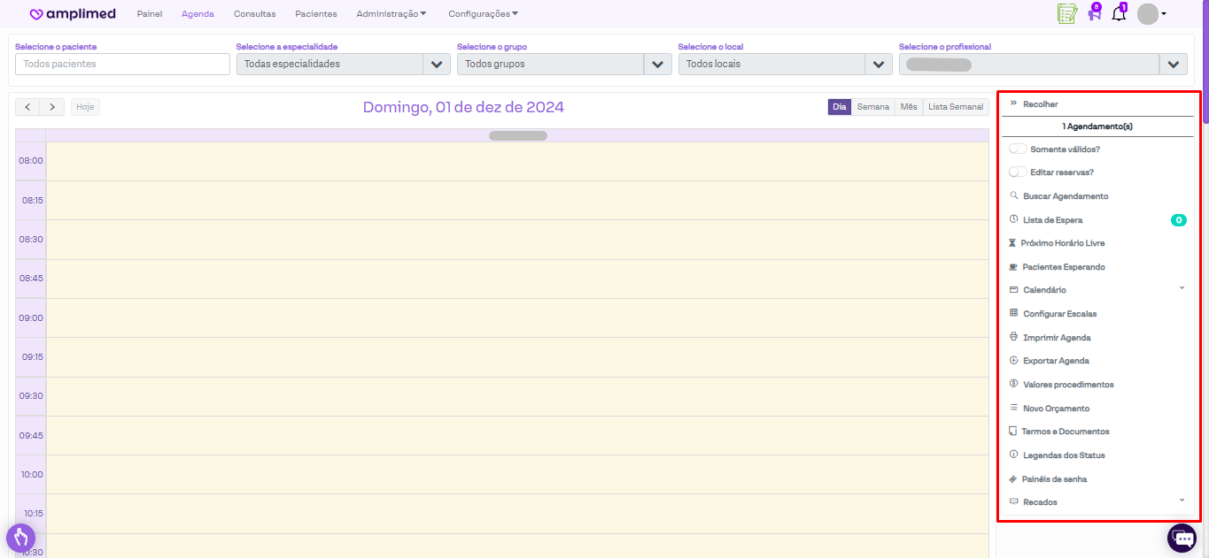 No menu lateral da agenda existem funções que podem facilitar o dia a dia em sua clínica, agilizando procedimentos e acelerando a busca por agendamentos e por horários. Além disso, é possível configurar sua escala, emitir termos e documentos e muito mais, sem sair da aba da agenda.