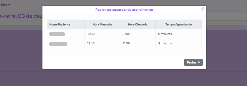 Ao clicar nesta opção, será exibido o nome do paciente, a hora do seu atendimento, a hora de chegada e o tempo que ele está aguardando