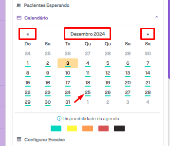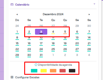A disponibilidade é uma função complementar que integra o calendário. Cada uma das cores se refere a quantidade de agendamentos proporcional ao tempo disponibilizado na escala do profissional para realizar agendamentos. As cores são separadas pelo percentual de 25% de preenchimento da agenda do profissional, com exceção da cor preta. Assim temos: menos de 25% (cor verde), 25 a 50% (cor amarela), 50 a 75% (cor laranja), 75 a 99% (cor vermelha) e quando a agenda chega a 100% de agendamento para o tempo disponibilizado (cor preta).